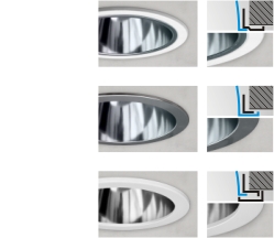 Um verschiedene Gestaltungsaufgaben zu realisieren, sind drei unterschiedliche Leuchtenabschlüsse erhältlich. Die Basis bildet der besonders schmale Standardring, bei dem sich der Reflektor in eine Vertiefung legt. Gestalterisch der deckenübergreifende Reflektor, der einen schmalen Einbauring abdeckt. Multifunktional das Wechselringsystem, welches aus einem montagefreundlichem Grundring besteht und mit vielen verschiedenen Zubehörteilen adaptiert werden kann. |