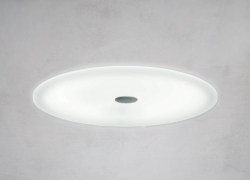 This recessed lighting panel has been specially designed to provide diffuse lighting of large rooms. Reduced to a basic form, the design is characterized by the large luminous glass surface. The glass is held by a centrally positioned stainless steel plate. The lighting panel is installed in a sawn ceiling aperture and mounted simply and quickly by spring clips. Powerful operation is ensured by the use of T5 circular fluorescent lamps in multi-flame format.
