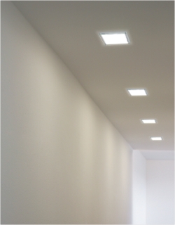 Standard one-piece, narrow, luminaire cover frame. The reflector edge sits in a slight recess and finishes flush with the surface.