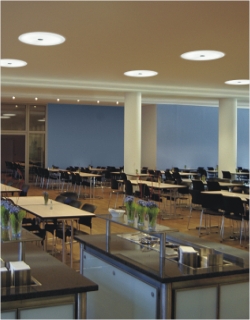 positionierte Edelstahlplatte. Das Lichtfeld wird in eine gesägte Deckenöffnung eingebaut. Einfache und schnelle Montage durch Federspangen. Leistungsstark durch den Einsatz von T5 Ringleuchtstofflampen in mehrflammiger Bestückung.